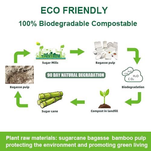 Sugarcane Bagasse Tableware is Eco friendly and has a number of advantages, including high temperature resistance, outstanding durability, lower weight than many other eco friendly tableware, uniform texture, customizable thickness as needed and the capacity to be composted.